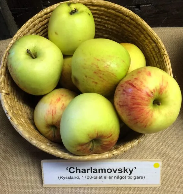 Äpple ’Charlamovsky’ Gröngult äpple med röd täckfärg.