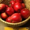 Medelstor gul frukt med röda strimmor.