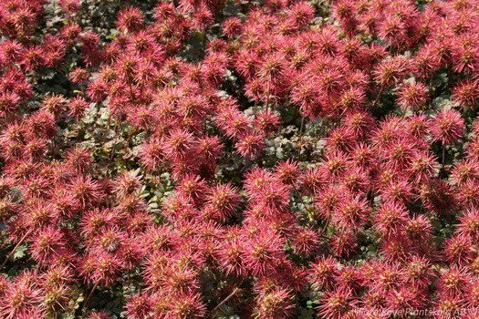 Vintergrön marktäckare som får vita blommor och fina, rödbruna fröställningar på hösten.