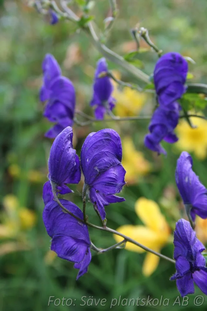 Mörkt blåvioletta blommor på höga stänglar. Fin till snitt, men är giftig. Trivs bäst i fuktig, näringsrik jord.