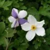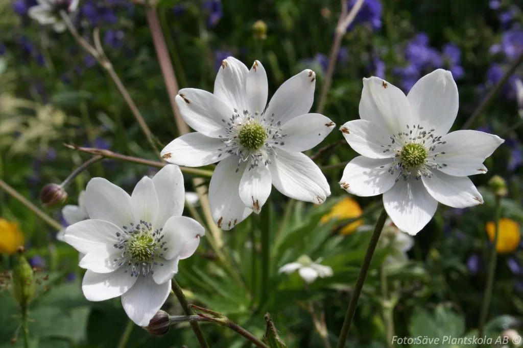 Vita stjärnformade blommor med purpurfärgad baksida och mörkgrönt bladverk. Påminner något om en stor vitsippa. Fin till snitt.