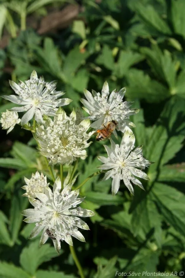 Mormorsväxt med vita, stjärnlika blommor i korgformade blomflockar. Fin till snitt.