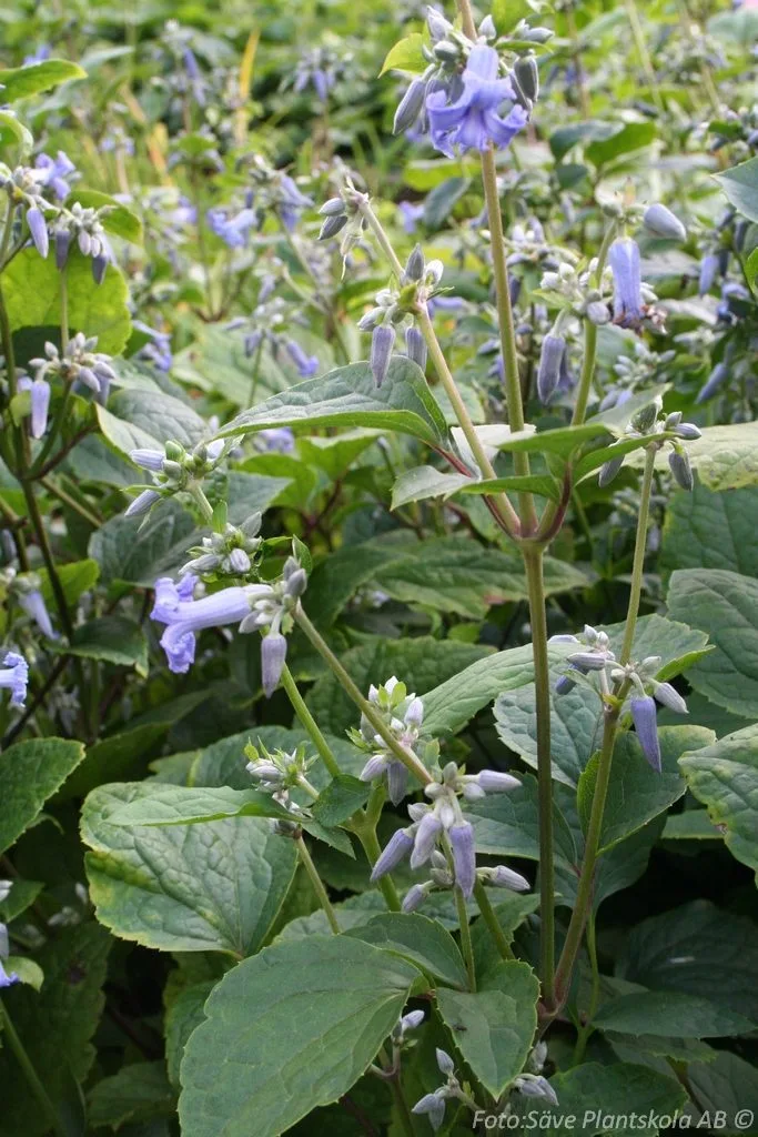 Ljust gröna blad och stabila stjälkar. Får små blå klockliknande blommor samlade i klasar. Ej klättrande. Behöver växtstöd.