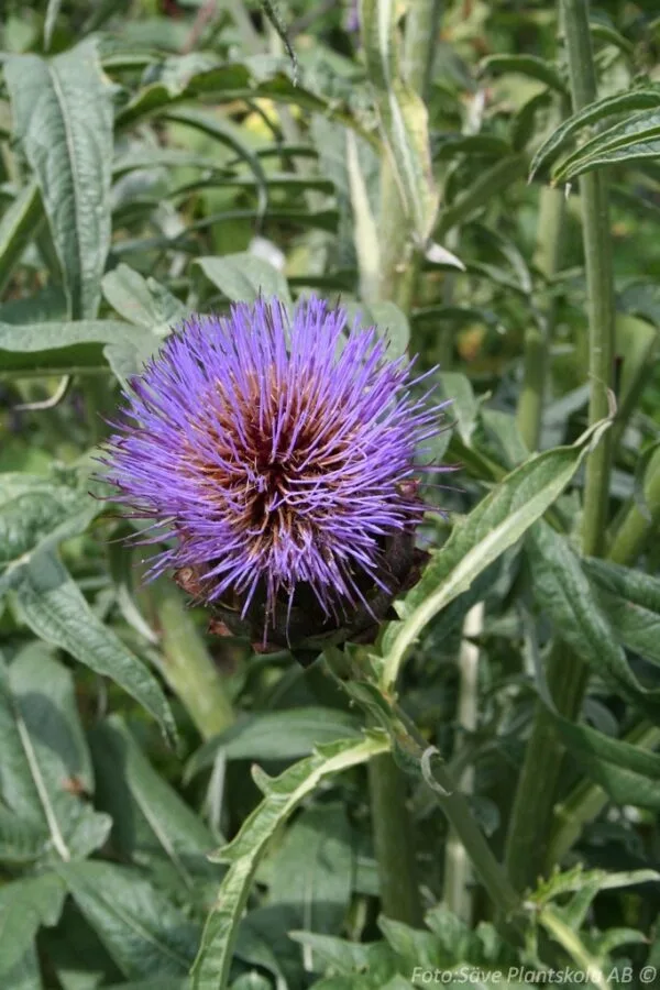 Tisteliknande köksväxt. Skördas när de nedre fjällen på blomknoppen vecklas utåt. Får en stor, lila blomma som även är fin till snitt.