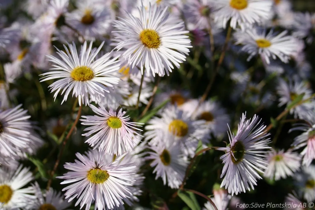 Lansettformade blad i rosetter med vita, prästkrageliknande blommor. Fin till snitt.