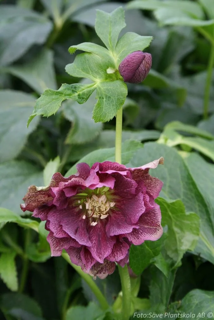 Vintergrön perenn som blommar tidigt med fyllda, mörkröda blommor. Fin till snitt.