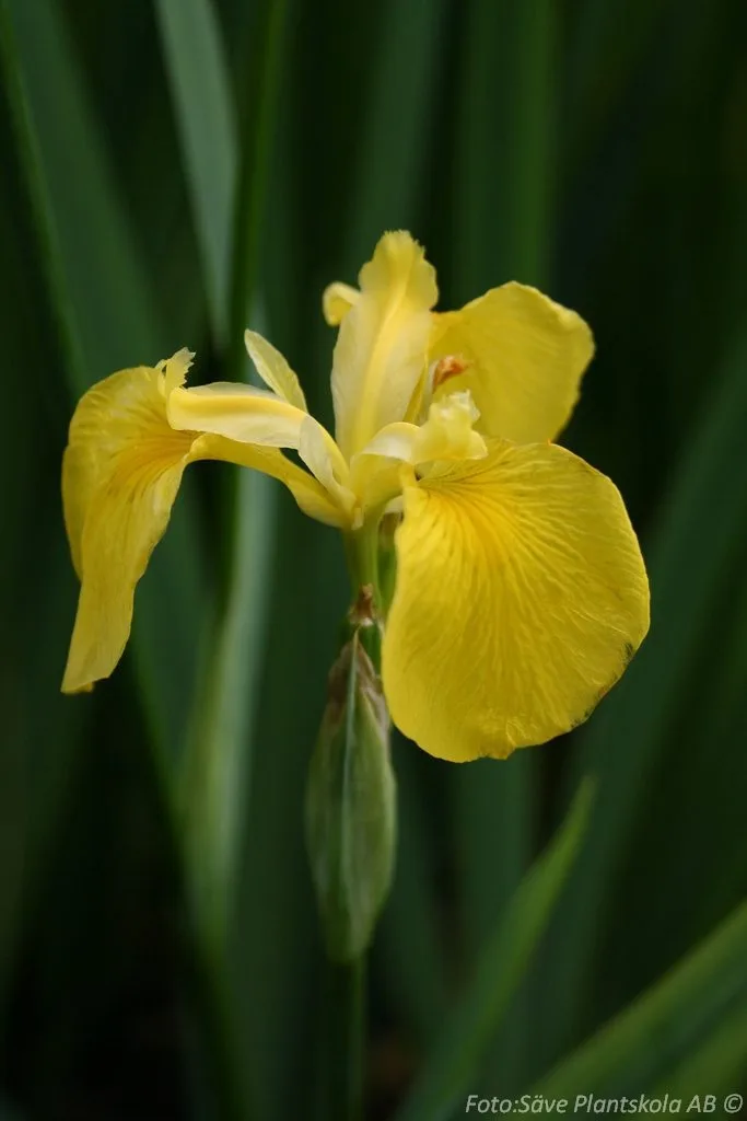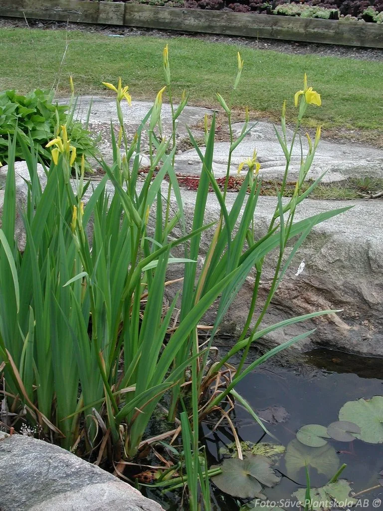 Svärdslika, gröna blad med gula blommor på höga stänglar. Passar utmärkt som dammväxt.