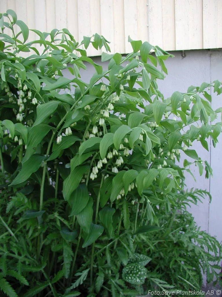 Lättskött perenn med böjda stjälkar och vita, klockformade klasar som blir till blåsvarta giftiga bär på hösten.