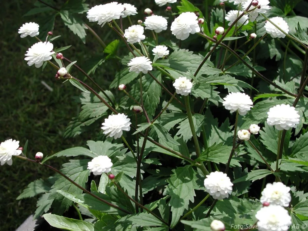 Fyllda, bollformade blommor på mörka stjälkar och flikiga blad med sågad kant.