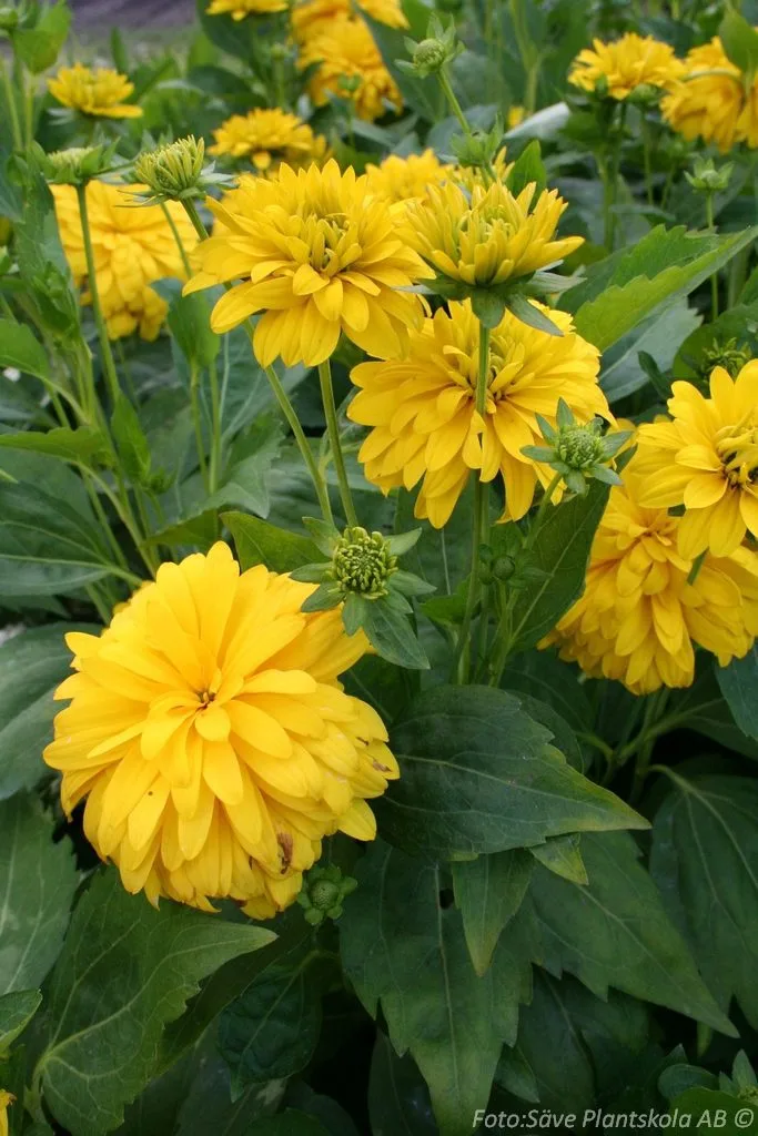 Rikblommande fyllda gula blommor på stabila stjälkar. Omtyckt av fjärilar och är fin till snitt.