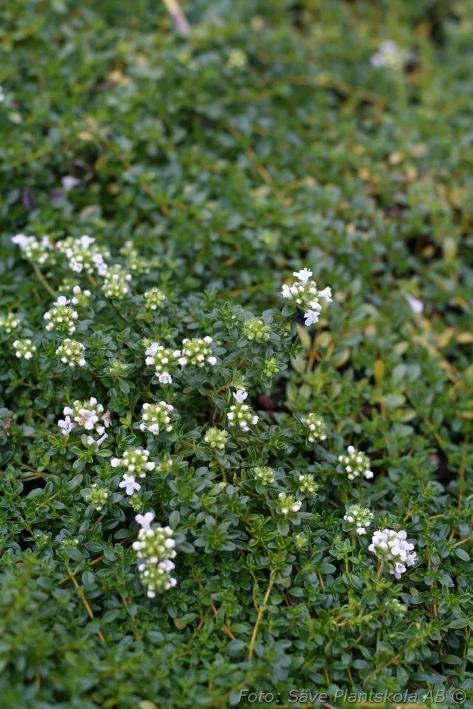 Aromatisk mattbildande perenn med vita blommor. Omtyckt av fjärilar och bin. Passar bra i stenpartier.