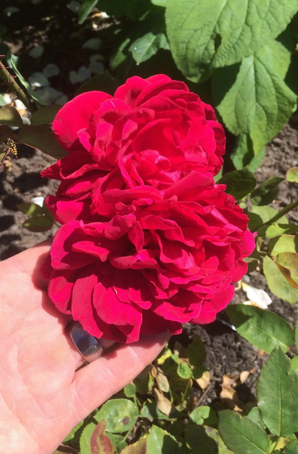 Kraftigväxande, tät buskros som får mörkt gröna, svagt glänsande bladverk. Får stora, mörkt röda, tätt fyllda blommor med medelstark doft. Remonterar och blommar från sommar till höst, trivs i soliga och näringsrika jordar.