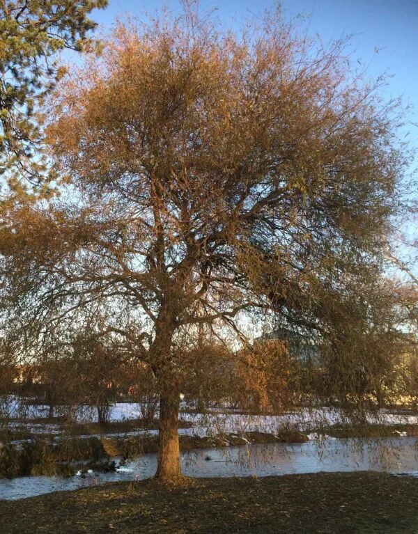 Ett medelstort, till något mindre träd som får ett upprätt, glest växtsätt med något hängande grenar. Bladen är friskt gröna och lansettlika med guldgula, tunna grenar. Trivs i soliga, mer fuktiga lägen, gärna vid vatten.